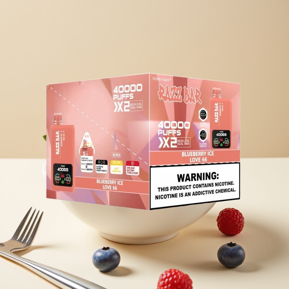 Razz Bar 40000 Puffs Jetable Vape – Écran d’affichage, 1.0Ω×2 Mesh Coil, Batterie 650 Mah, Port Type-C – MYRTILLE GLACÉE & LOVE 66